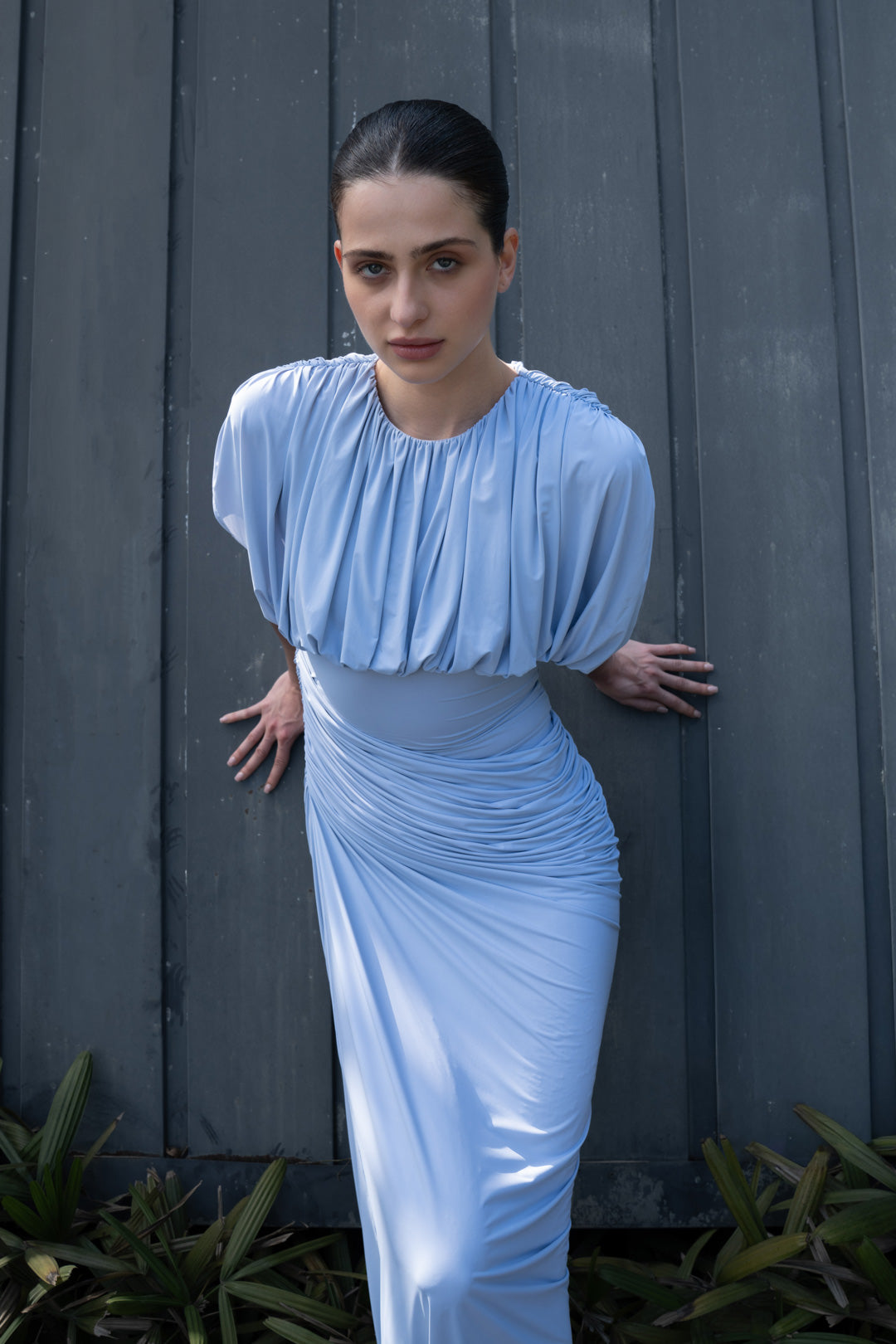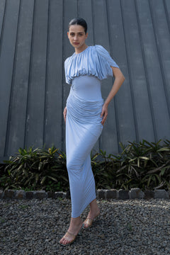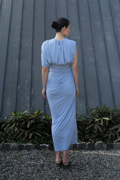 • An ash blue dress designed with a softly gathered high neckline and relaxed draped bodice. The fitted waist transitions into a ruched skirt that contours naturally through the hips.