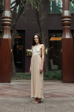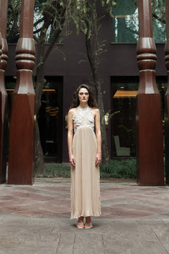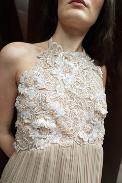 BEIGE HALTER PLEATED GOWN