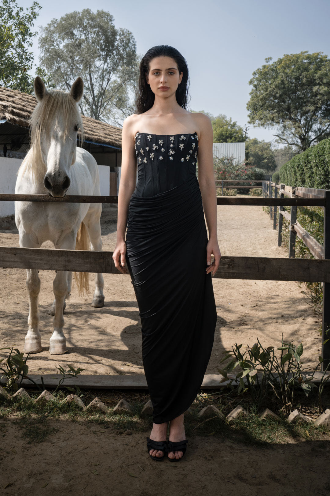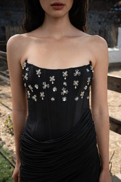 BLACK EMBELLISHED STRAPLESS DRAPED DRESS