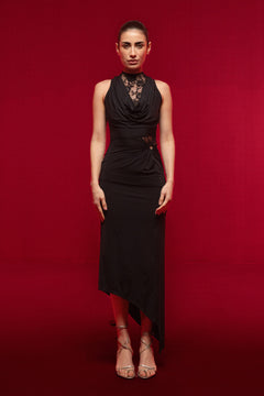 • Black midi dress with a halter neckline, a cowl and lace panel at the bust. Features soft draping across the bodice, side cut-out with ring detail, fitted waist, and an asymmetrical hemline.