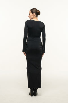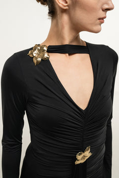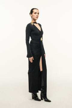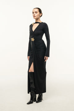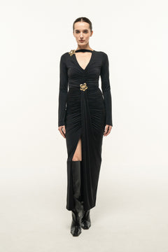 • Long sleeve maxi dress with a v neck cut out detail, and a front slit. Features gold floral embellishments at the neckline and waist. Fitted silhouette.