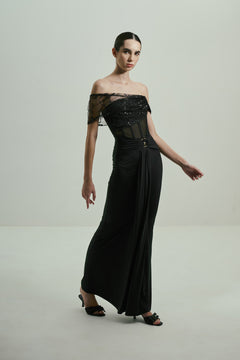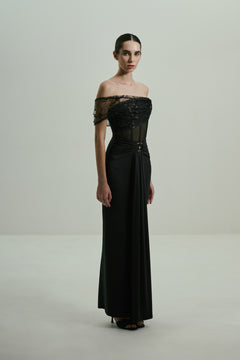 - A striking black off-shoulder gown with a sequined bust and draped shoulder detail. The corset-style waistline is cinched with a statement ring accent, flowing into a sleek, floor-length silhouette.