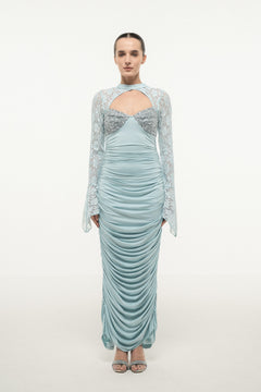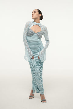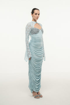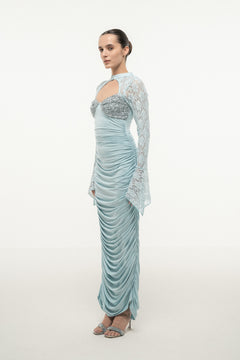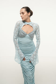 • Light blue ankle-length dress featuring lace long sleeves, a high neckline, and a front cut-out. Designed with a sequin fabric bust and a fitted silhouette with soft ruching through the skirt.