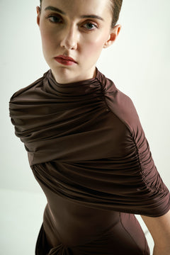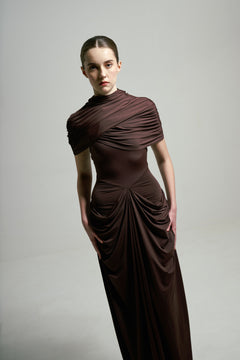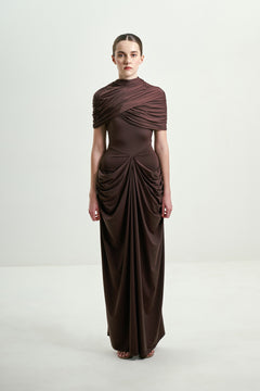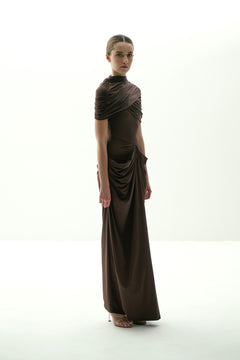 BROWN DRAPED GOWN WITH DETACHABLE CAPE