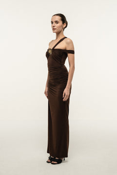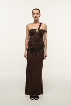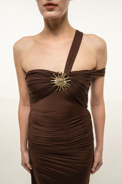 BROWN ONE-SHOULDER DRAPED MAXI DRESS WITH GOLD STAR DETAIL
