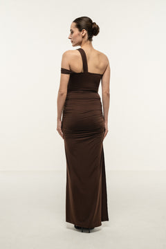 • Brown fitted maxi dress with an asymmetrical one-shoulder neckline and soft draping across the bodice and skirt. Features gathered detailing at the waist, finished with a gold metal trim at the bust.
