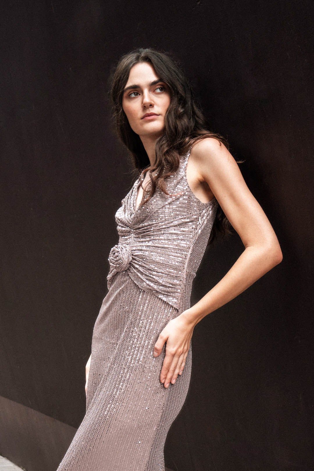 - Full-Length Brown Sequin Gown Featuring A Sleeveless Cut and A Deep V-Neckline. The Bodice Gathers into A Central Flower Detail at The Waist, Ideal for Evening Events.
