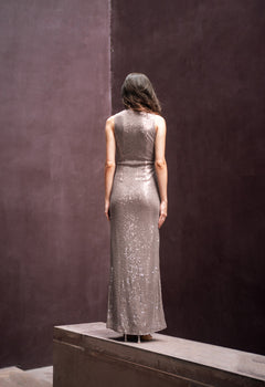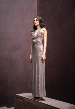 BROWN SLEEVELESS SEQUIN GOWN WITH KNOT DETAIL