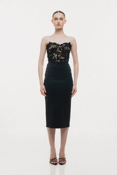 - This chic bodycon midi dress features luxurious lace and scuba fabric, an off-shoulder neckline, and stylish golden buttons—perfectly balancing elegance and allure in a stunning black silhouette.