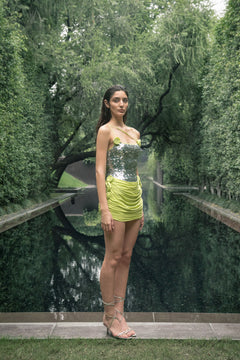 - This Mini Dress Features A Silver Sequin Bodice with Slim Shoulder Straps and A Ruched Green Skirt. Side Flower Details and A Fitted Silhouette Perfect for Evening Events.