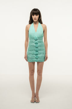 HALTER MINI DRESS WITH RUCHED SKIRT AND ROSETTE DETAILS