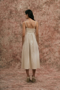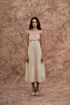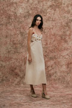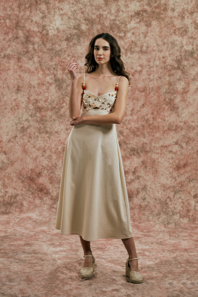 - Ivory midi dress with a fitted bust. bust is decorated with seashells and beadwork, giving it a unique handcrafted look. Finished with beaded straps detail. Perfect for resort wear.