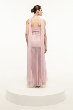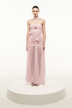 • Light pink gown featuring a ruched bodice with boning, rosette appliqués at bust, waist and hip, with sheer draped panels layered over a fitted inner silhouette and matching sheer stole.