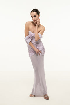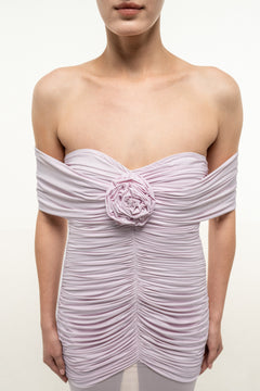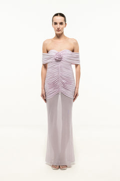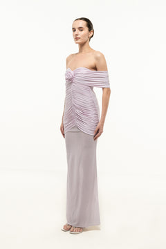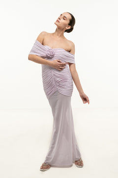 • Off shoulder flared dress with ruched detailing on the bodice and a front rosette accent. Features a fitted upper silhouette with a soft, flowy skirt, suitable for evening and occasion wear.