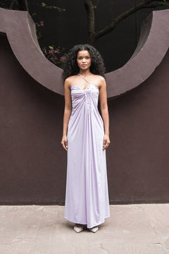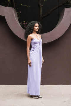 - Soft Lilac Gown Featuring A One-Shoulder Strap and A Gracefully Draped Silhouette. The Design Includes Gentle Pleating from The Bodice That Extends Down the Length of The Dress.