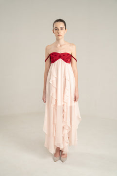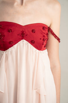 - A playful dress with a strapless sweetheart red bustier with delicate embellishments and side straps on each arm. The dress flows into a soft pink midi-length skirt with ruffle details down the front.