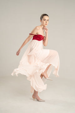 PINK FLOWING MIDI DRESS WITH RED EMBELLISHED BUSTIER