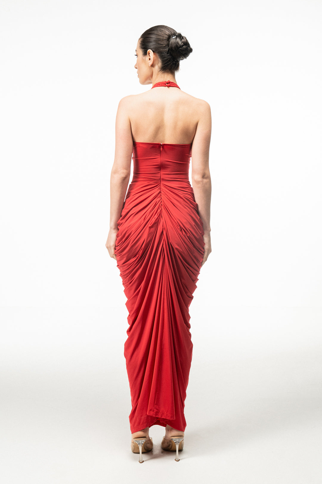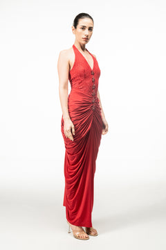 RED HALTER NECK DRAPED MAXI DRESS
